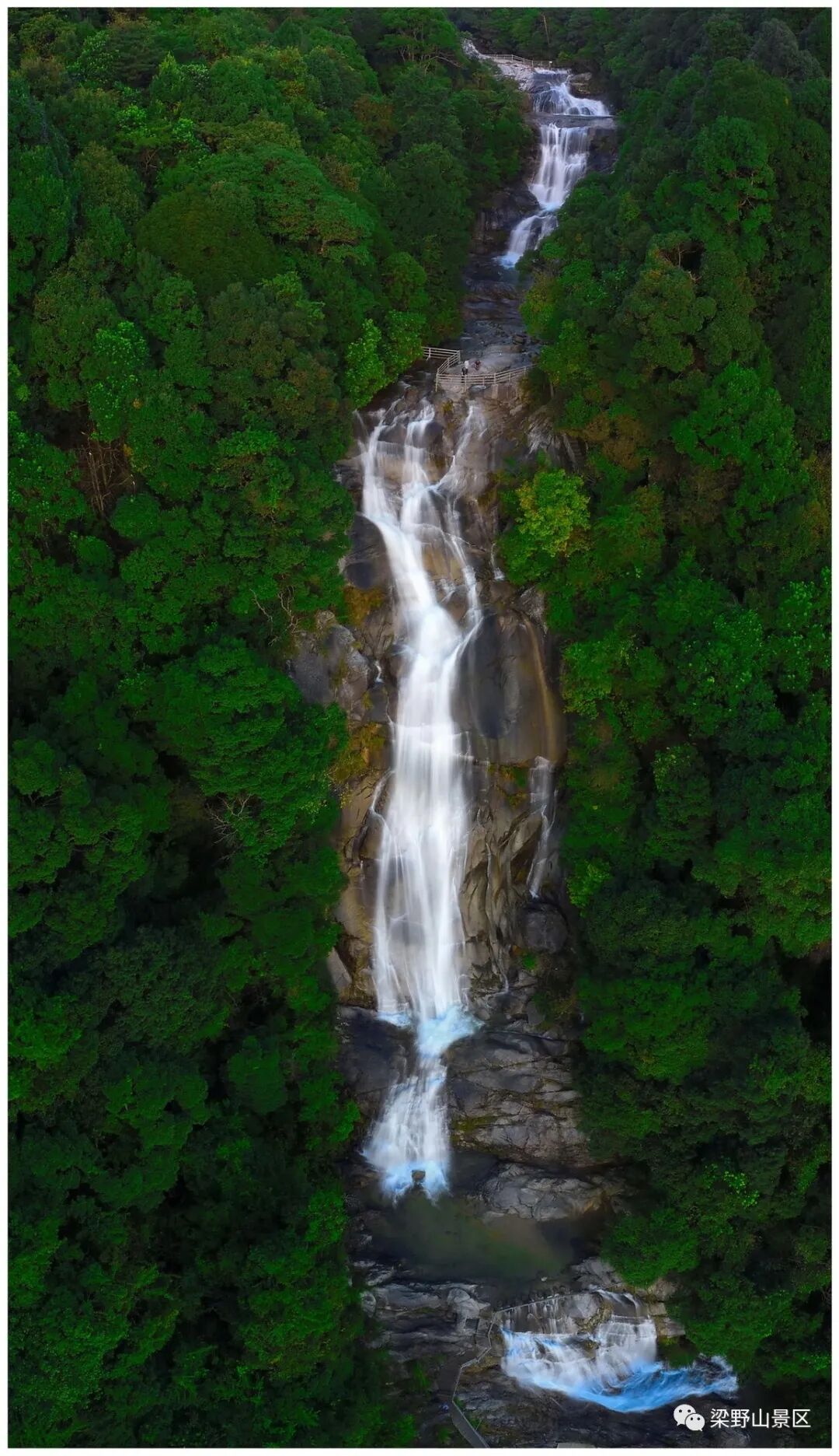 高空俯瞰犹如一条巨大的龙,龙体似白玉,腾空而下。近看是由两个主要瀑布组成,第一个是飞云瀑(佛光瀑),其次是金龟瀑。在层林叠翠中流动。