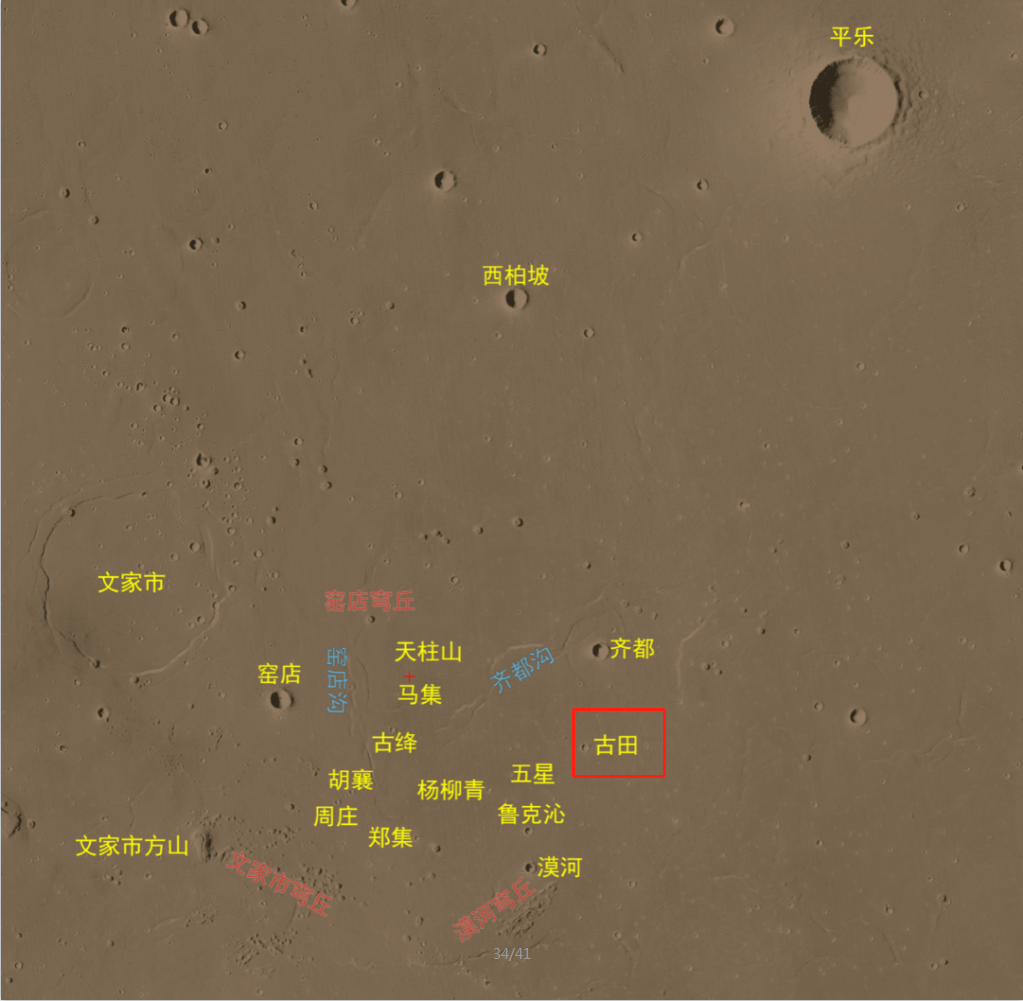 科学研究团队通过火星高分影像,识别了着陆点附近大量的地理实体,国际天文联合会根据相关规则,将其中的22个地理实体,以中国人口数小于10万的历史文化名村名镇加以命名,其中,13号地理实体以福建龙岩的古田镇命名。将中国标识永久刻印在火星大地。