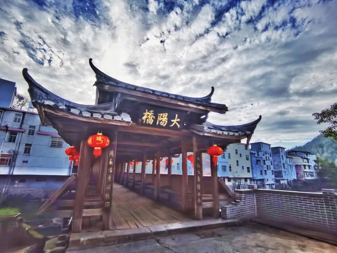 紧接着,壮观的太阳桥映入眼帘,太阳桥依山傍水,设计风格独特,雄伟的廊桥构思高明,精湛的技能令人钦佩,它不但壮丽而且牢固,体现了古人的智慧。随着时光穿越连石头都会风化,木材还没腐朽,证明了古人对防水防漏做得天衣无缝。廊桥不仅是通行也是累了歇息和夏天纳凉的好地方,廊桥两旁全是木凳子,至今还能成为河两岸人们安全来往的纽带,给大家带来诸多的便捷。全部的接头都是镶嵌而成,形成了一个整体的廊桥,所以经得起岁月的洗礼,至今它依然坚韧不拔地屹立在两岸之间。