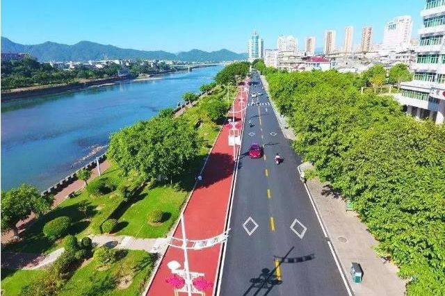 汀江绿道位于福建省龙岩市上杭县县城辖区内,主要利用汀江沿岸缓冲带,塑造城市内部的开放空间,以穿过上杭县城的客家母亲河“汀江河”为主脉,构建迎山接水通廊,概括为“一江、四带、十二景”的旅游观光结构。