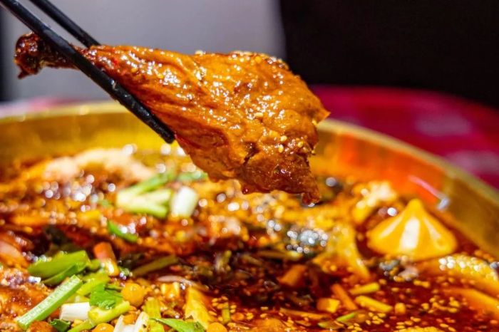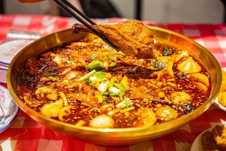 油亮亮的烤鸭切成块,放到冒菜的汤锅里面冒一会儿捞出,上桌后浇上汤汁,鸭肉变得肥厚多汁,任何一个人都无法拒绝诱惑!