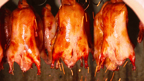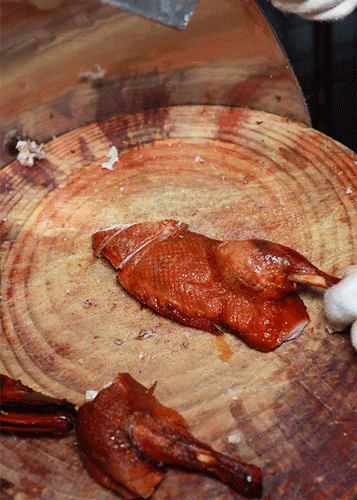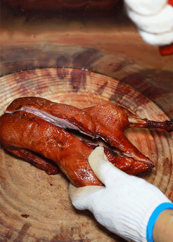 冒烤鸭讲究先烤后冒,肥美的鸭子先进炉烘烤个九分熟,烤得表皮焦黄、外酥里嫩再开始冒。