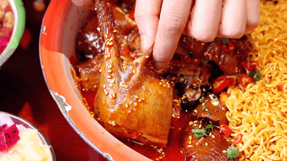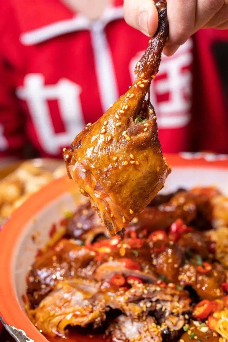 咬一口烤鸭外皮还保持脆润的状态,麻辣鲜香的汤汁全都钻进了烤鸭肉中,吃起来汁水在口中四溢,爱了爱了...