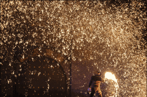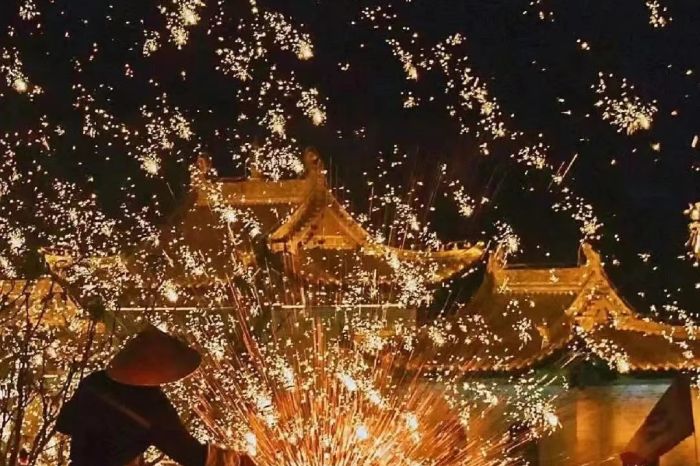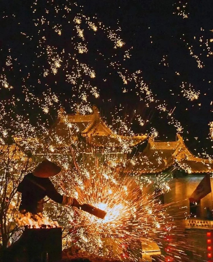 炽热的铁水被打向高空黑夜之中星火炸裂
