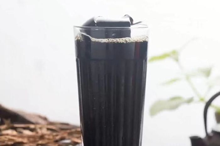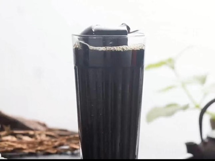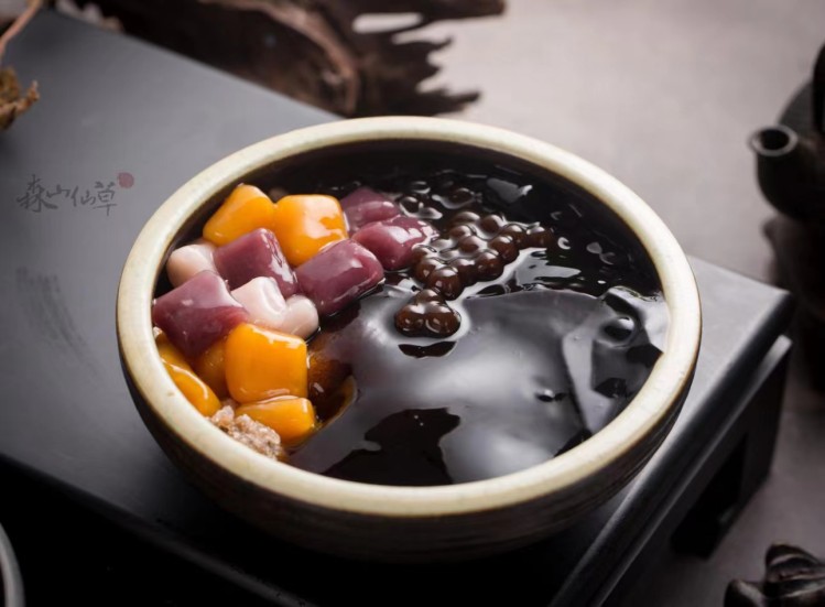 最后将仙草汁倒入器皿中,待凝固后放入芋圆,