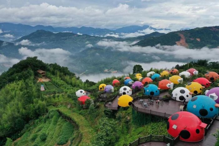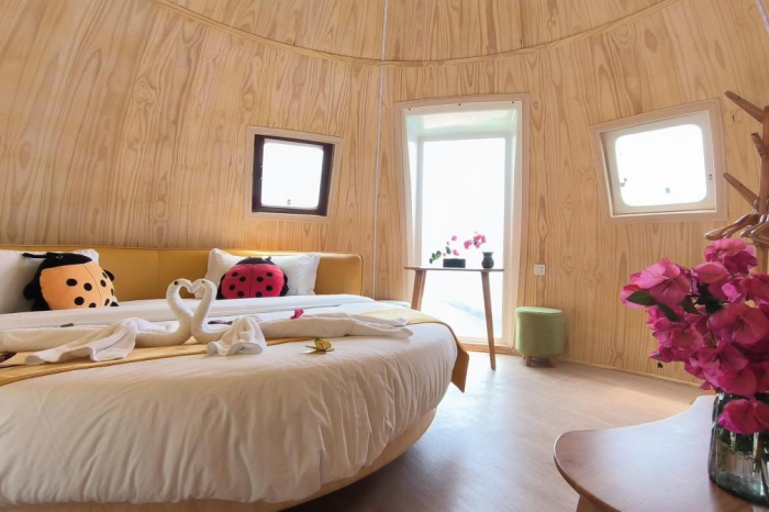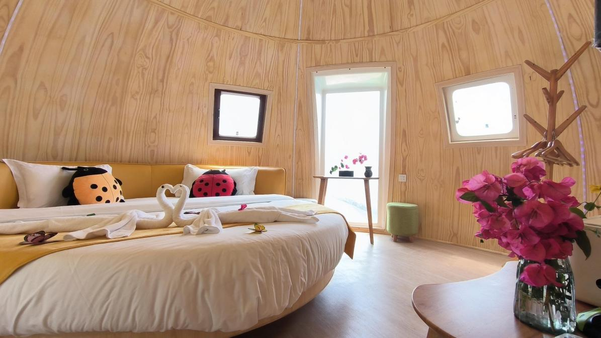 七星瓢虫屋位于官畲风景区内,错落在樱花园中,是景区的网红打卡景点之一。每间室内面积为18.8平方米,根据七星瓢虫主题元素进行室内布置。内部设有独立卫生间、电视、空调、热水器、wifi等配套设施。