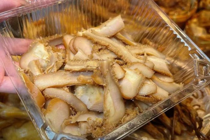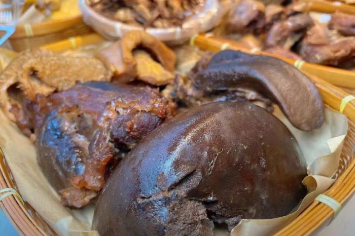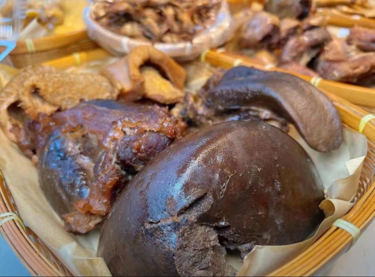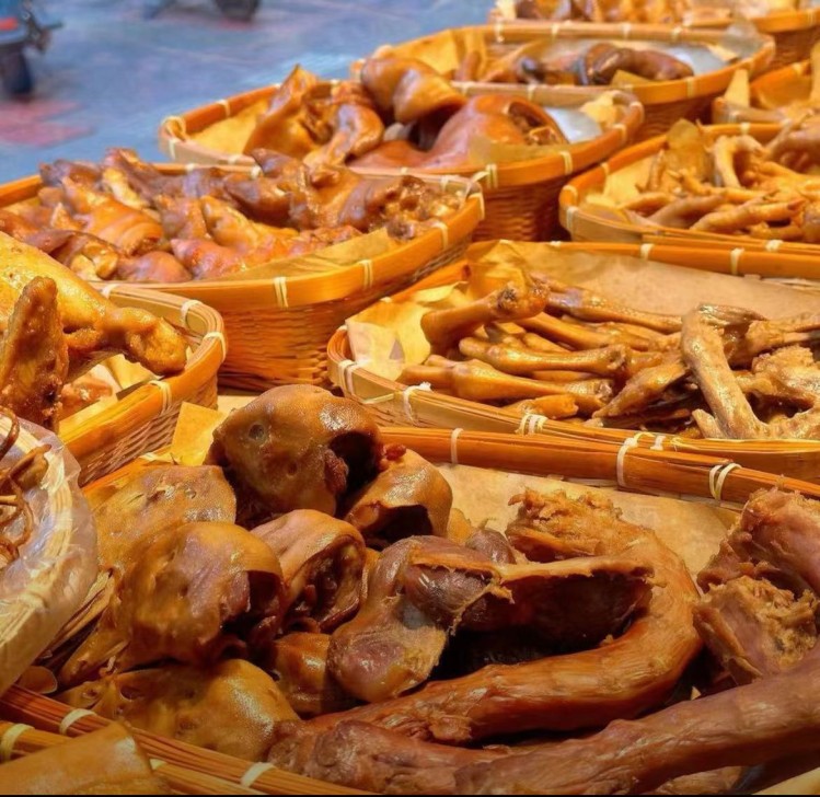 每日精选食材后,经过细心的处理,卤料提前腌制好,在大锅中精心熬煮,每一种食材都泛着诱人的金黄色泽,带着扑鼻的香气。