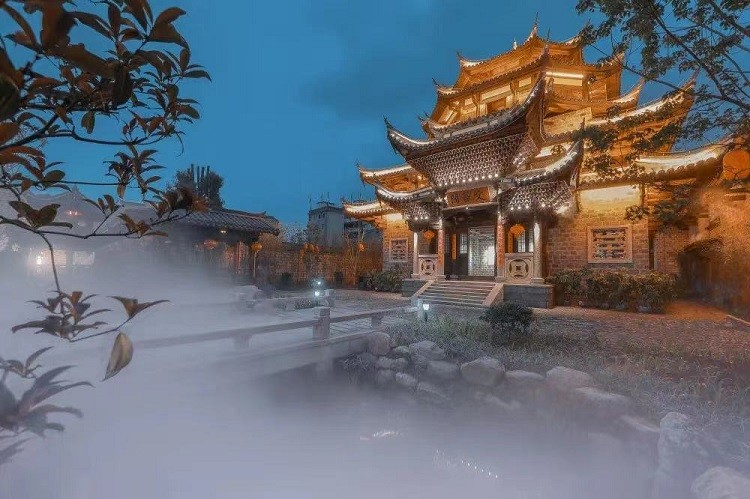 访书院古风建筑,待池中白雾绕起,便犹如置身仙境里
