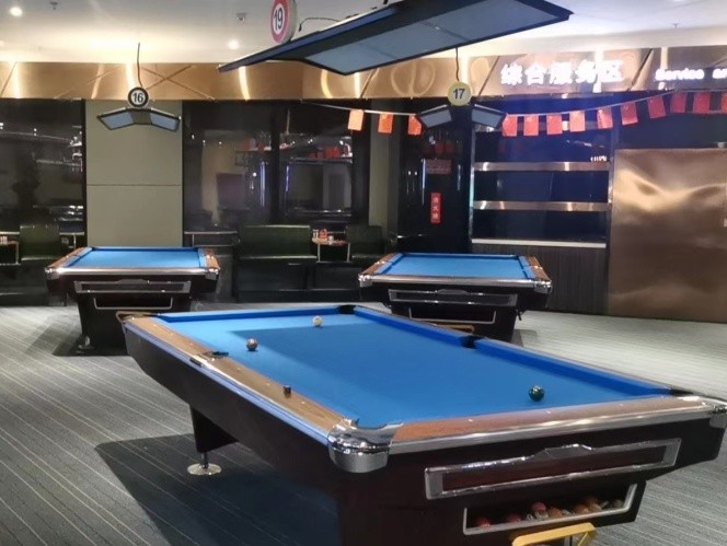 场所设有26台全新的专业球桌和上百架球杆,占地面积达上千平方!场内设有自助区、贵宾区、休闲区和吧台等区域,全场可容纳上百人!