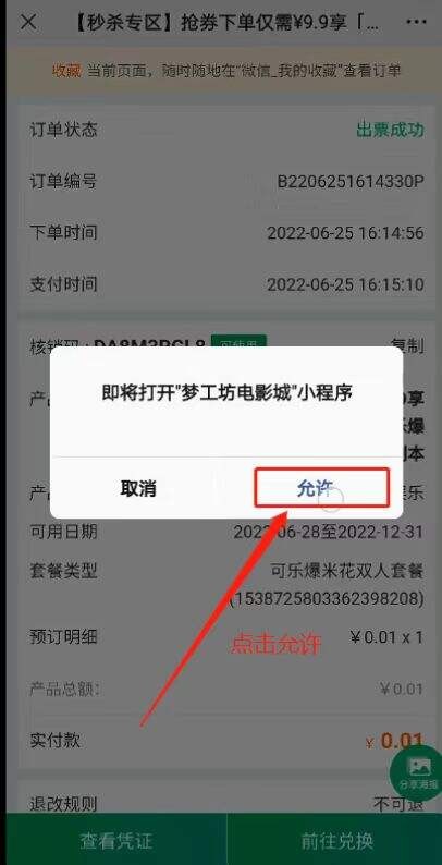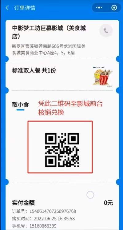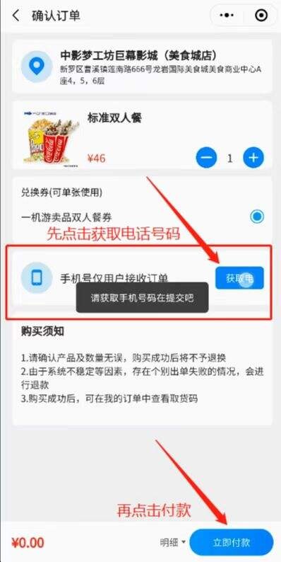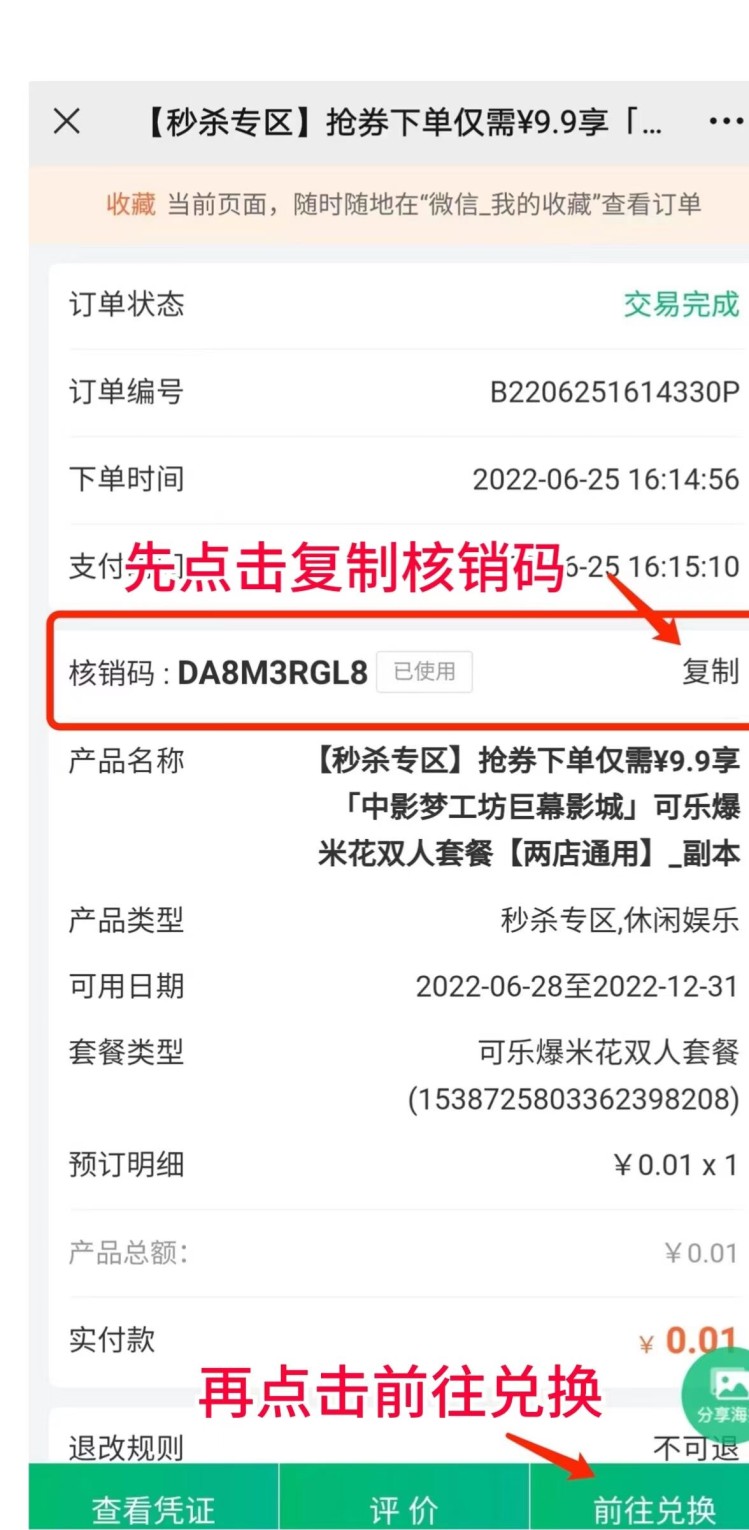 1、复制核销码前往兑换->2、点击“允许”,跳转到梦工坊电影城小程序->3、选择龙岩的美食城或者天成店->4、点击我的-优惠券进去兑换->5、粘贴核销码-兑换,兑换成功(兑换成功后不可退改)->6、点击商城选择爆米花可乐套餐->7、点击获取电话号码-立即付款->8、凭二维码至影城前台核销兑换!