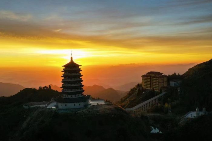 天宫山海拔1594米,山顶便可观望八方。山地海拔高落差大,登山可观日出日落、云海、群山层峦叠嶂,自然风光无限好,一直以来吸引着四面八方的游客前来游览。登山顶,放眼眺望巍峨山岭在翻滚的云海中渐渐清晰,一颗红日迸发万丈光芒,点点村舍刻画桃园生活情怀,入目皆景超凡脱俗的感受油然而生。