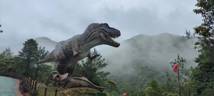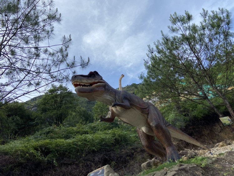 天宫山恐龙谷,借湖山之胜,依人文之厚,通过对恐龙的深入挖掘,以全新的创意策划设计,将恐龙文化与自然山水、研学教培相结合,打造以“生态旅游、科普研学、 亲子游乐、情境重现、特色商品”为主的旅游新业态形式,实现恐龙文化体验的升级蝶变,吸引了不少着大江南北的游客来此。