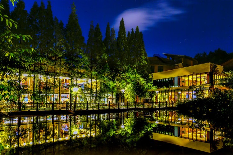 远远望去,酒店和自然山色融成一体,竹林与溪水为证,在大自然的怀抱之中,悠然自得,仿佛古代小说中隐藏的世外桃源,让人想一探究竟。
