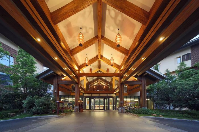 远远望去,酒店和自然山色融成一体,竹林与溪水为证,在大自然的怀抱之中,悠然自得,仿佛古代小说中隐藏的世外桃源,让人想一探究竟。