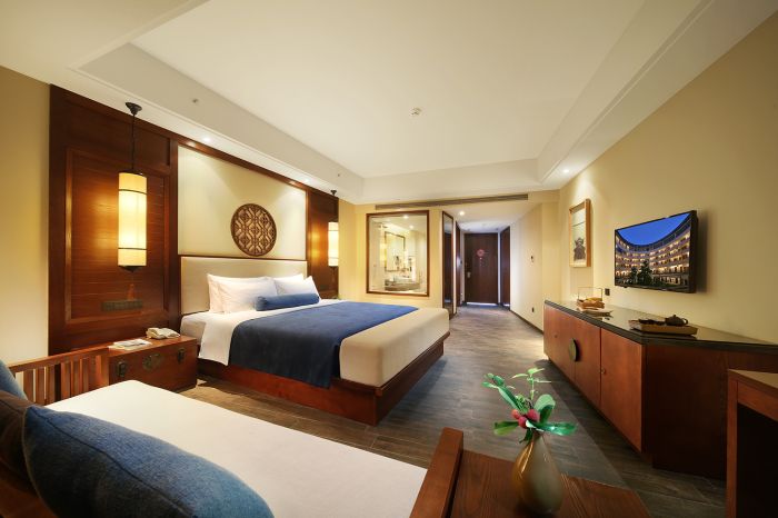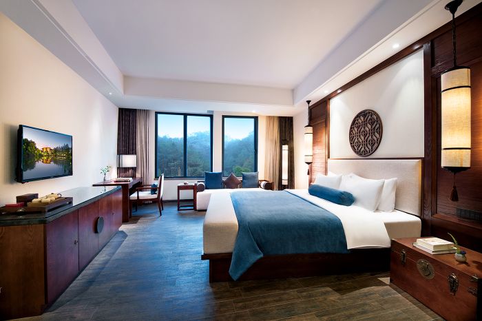 龙岩冠豸秘谷佰翔度假酒店拥有105间各式豪华观景客房,典雅舒适的空间内,客家风格装饰布置温馨,甄选樟木家居,悬挂着木式雕花,干净利落,尽展眼前。