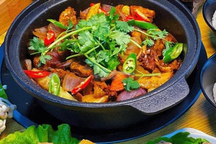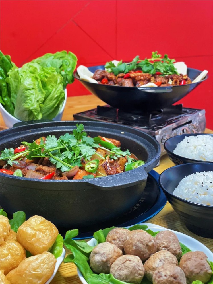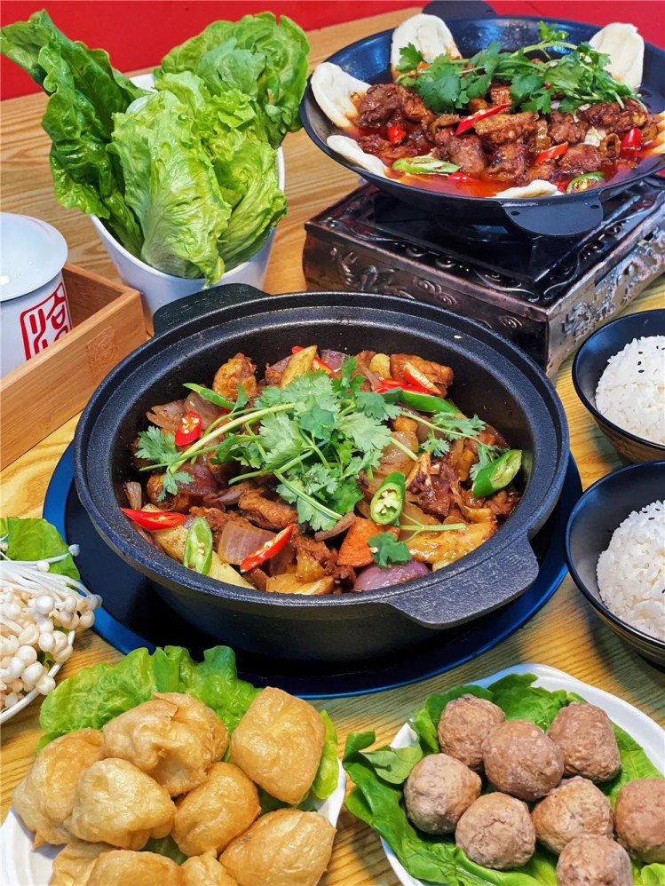 吃地锅鸡或鸡公煲,也有各种菜品搭配